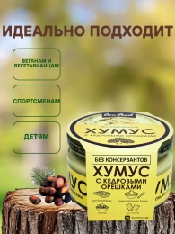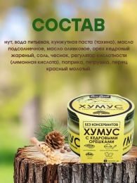 Нут, вода питьевая, кунжутная паста (тахина), масло подсолнечное, масло оливковое, орех кедровый жареный, соль, чеснок, регулятор кислотности лимонная кислота, паприка, перец красный молотый.