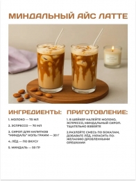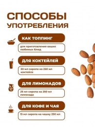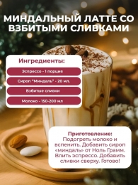Вода, эритрит, полидекстроза (пребиотик), мальтодекстрин, ксантановая камедь (природный полисахарид), сорбиновая кислота, лимонная кислота, ваниль, ароматизатор "Миндаль", колер карамельный, экстракт стевии.