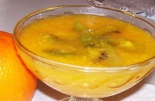 Апельсин и киви чистим и режем маленькими кубиками. В кастрюльку высыпаем апельсиновые кусочки и ставим на средний огонь. Когда выделившийся сок начнет кипеть (3-5 минут), выключаем огонь, добавляем 1 ч. л. без горки агар-агара перемешиваем и закрываем крышкой. Через 10 минут выкладываем кусочки апельсина в формочки для желе, при этом формируя углубление, то есть распределяем желе по стенкам формочек. Ставим желе остывать в холодильник на 10-20 минут. Тем временем ставим на огонь 100 мл кокосовой воды(кокосовое молоко) с сахарозаменителем. Помешивая, доводим до кипения и добавляем 0,5 ч. л. агар-агара. Хорошо перемешиваем, при необходимости разбиваем комочки блендером. Оставляем под крышкой минут на пять. Выливаем кокосовую смесь на застывший первый слой желе с фруктами, в углубления. Ставим снова в холодильник на 10-20 минут до застывания. Аналогично готовим слой с киви. Выкладываем готовый киви в наши формочки и отправляем их на финальное застывание в холодильник на 30-60 мин. После этого достаем фрукты в желе из формочек (аккуратно проникнуть ножом между желе и формочкой, воздух попадет между ними и желе отлично выйдет).