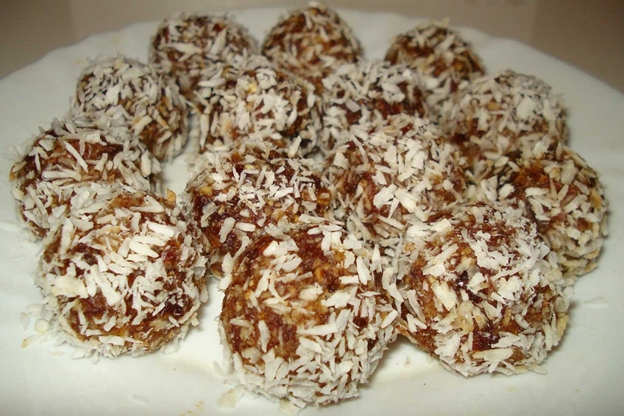 Финики и какао перекрутить в комбайне или блендере до состояния однородной массы. Из полученного теста сформировать пирожные. Сверху можно украсить кокосовой стружкой.