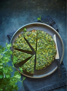 Разогрейте духовку до 220°. Смешайте в блендере все ингредиенты для основы. Оставьте на 30 минут. Разогрейте в сковороде оливковое масло. Добавьте укроп и лук-шалот и жарьте пока они не станут мягкими и не подрумянятся. Добавьте остальную зелень и тушите еще 2 минуты, затем снимите с огня. Смешать основу и зелень, затем поместите сковороду в духовку. Выпекайте 10 минут или до готовности. Подавайте горячим.