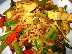 Отвариваем лапшу в подсоленной воде до готовности, сливаем воду. Отвариваем фасоль в течение 5 мин в кипящей воде, не забываем посолить. Сливаем воду. Перец моем, чистим и нарезаем соломкой Тофу режем кубиками Сковороду смазываем рыжиковым маслом, выкладываем в нее фасоль, перец, тофу и тертый чеснок и обжариваем минут 5, периодически помешивая.