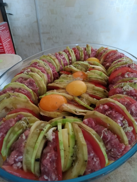 Готовим поджарку(лук+перец болгарский+помидоры 2 шт+томатнаяя паста) нарезать кубиками и обжарить на сковороде до полуготовности. Выложить в стеклянную форму на дно и равномерно распределить.