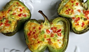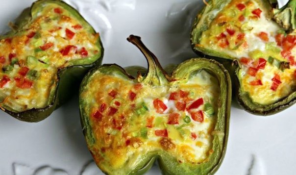 Взбиваем белки, солим, добавляем помидоры и лук. Вливаем смесь в половинки перцев и запекаем в духовке 30 минут.