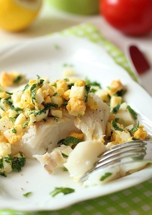 Чистим рыбу от косточек и кожи и складываем кусочки в сковороду или сотейник. Заливаем рыбным бульоном(рыба должна быть покрыта бульоном полностью, но не выше). Посыпаем тертым яйцом и зеленью. Тушим 5-7 минут