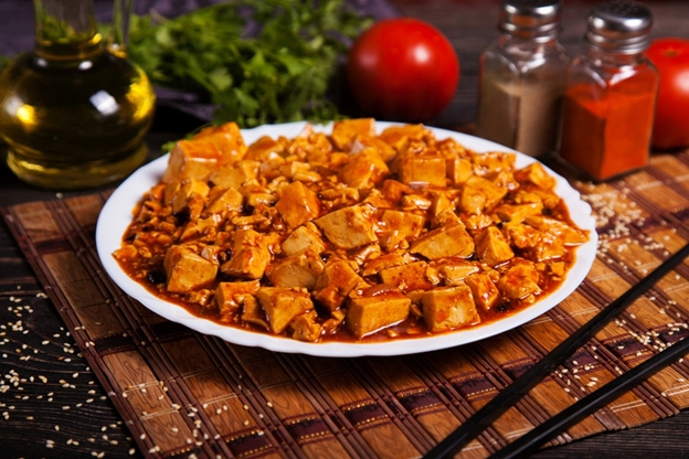 Сварите ширатаки по инструкции. Желтый перец и лук нарежьте кусочками. Нарвите листья салата. Мелко нарежьте перец чили и удалите семена. Промойте тофу, промокните бумажным полотенцем. Нарежьте тофу кубиками по 2 см. В небольшой миске смешайте соевый соус, томатное пюре, сироп агавы, яблочный уксус и половину перца чили с 2 ст. л. холодной воды. Выложите тофу в миску с мукой и щепоткой соли. Аккуратно перемешайте. Разогрейте сковороду с 2 ч. л. масла на среднем огне и обжаривайте тофу в течение 10 минут, периодически помешивая, до золотистого цвета. Затем добавьте лук и перец, жарьте 5 минут до размягчения. Добавьте соус и убавьте огонь. Готовьте 1-2 минуты, пока соус не загустеет. Подавайте с рисом ширатаки. Украсьте орехами кешью и оставшимся перцем чили.