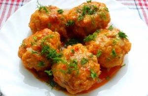 Сковороду смазать рыжиковым маслом, выложить тефтели и залить их томатным соусом.