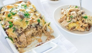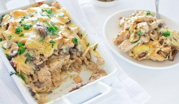 Курицу мелко нарезать, обжарить на сковороде, добавить специи, соль и выложить в стеклянную форму или любую другую. Грибы промыть и так же обжарить с луком на сковороде с добавлением воды, подсолить. Как только лук будет готов, добавить сметану и потушить еще 5 мин. Если сливочный соус будет жидкий, добавить нутовую муку(должна быть консистенция густой сметаны). Выкладываем сливочную смесь с грибами на курицу и посыпаем натертым сыром. Запекаем в духовке при температуре 220 градусов 15 мин.