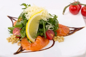 Рыбку нарезать полосками или кубиками, помидорки пополам. Все ингредиенты смешать в салатнике. Оливковое масло смешать с бальзамическим уксусом в соотношении 1:1. Заправить салат, посыпать кунжутом, украсить лимоном и орешками.