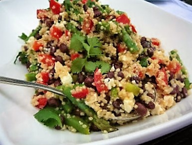 Предлагаем вам попробовать наши диетические блюда из киноа! В этом красивом салате в стиле мексиканской кухни используется и обыкновенное, и красное киноа. Салат из киноа с черной фасолью и овощами - один из тех видов еды, вкус Вас приятно удивит, а регулярное употребление доставит огромную пользу организму. Такой салат имеет приятный вкус, а также содержит бобовые крупы, обогащенные витаминами, питательными и минеральными веществами в количестве, которое почти удовлетворяет суточную потребность. Польза киноа и бобовых круп уже давно доказана специалистами многих стран мира, поэтому такой салат можно употреблять в любых разумных количествах без ущерба для здоровья.