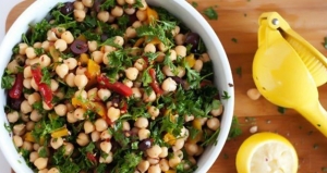 - В большой миске смешайте нут, помидоры(разрезать пополам), оливки, огурец(очистить от кожуры и порезать кубиками), петрушку, лук(порезать кубиками или полукольцами) и перец. Заправьте салат смесью из лимонного сока. Цедру лимона добавляйте по желанию.