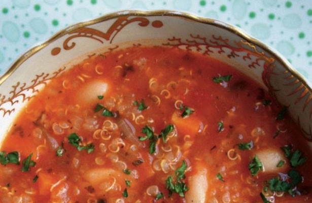 Налить масло в большую кастрюлю. Поставить на средний огонь. Положить в масло мелко нарезанный лук, морковь и сельдерей и жарить в течение 5 минут. Затем добавить фасоль и чеснок и жарить еще пару минут. Помидоры почистить и порезать. Добавить резаные помидоры и овощной бульон. Варить 20 минут. Всыпать киноа, добавить петрушку, орегано или иную зелень и лавровый лист. Варить 12-15 минут, пока киноа не разварится. Посолить и поперчить по вкусу.