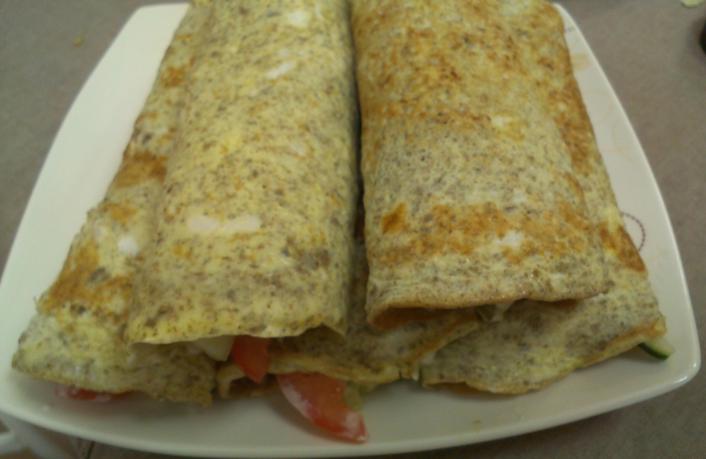 3.Блин смазываем соусом, кладем листья салата, овощи, грудку и заворачиваем в чудесный ролл))
