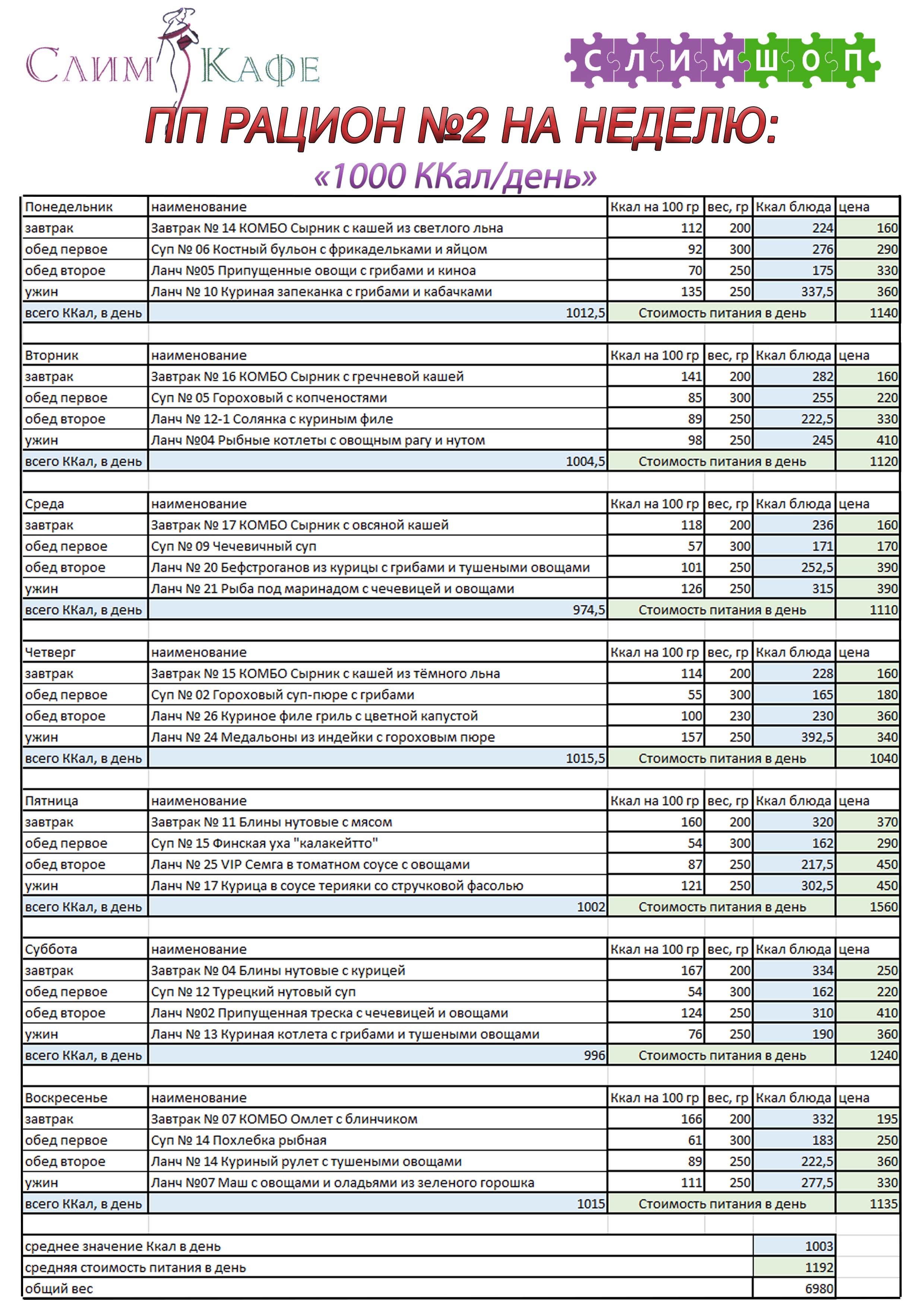 | Среднее значение Ккал в день | 1003 | ||||