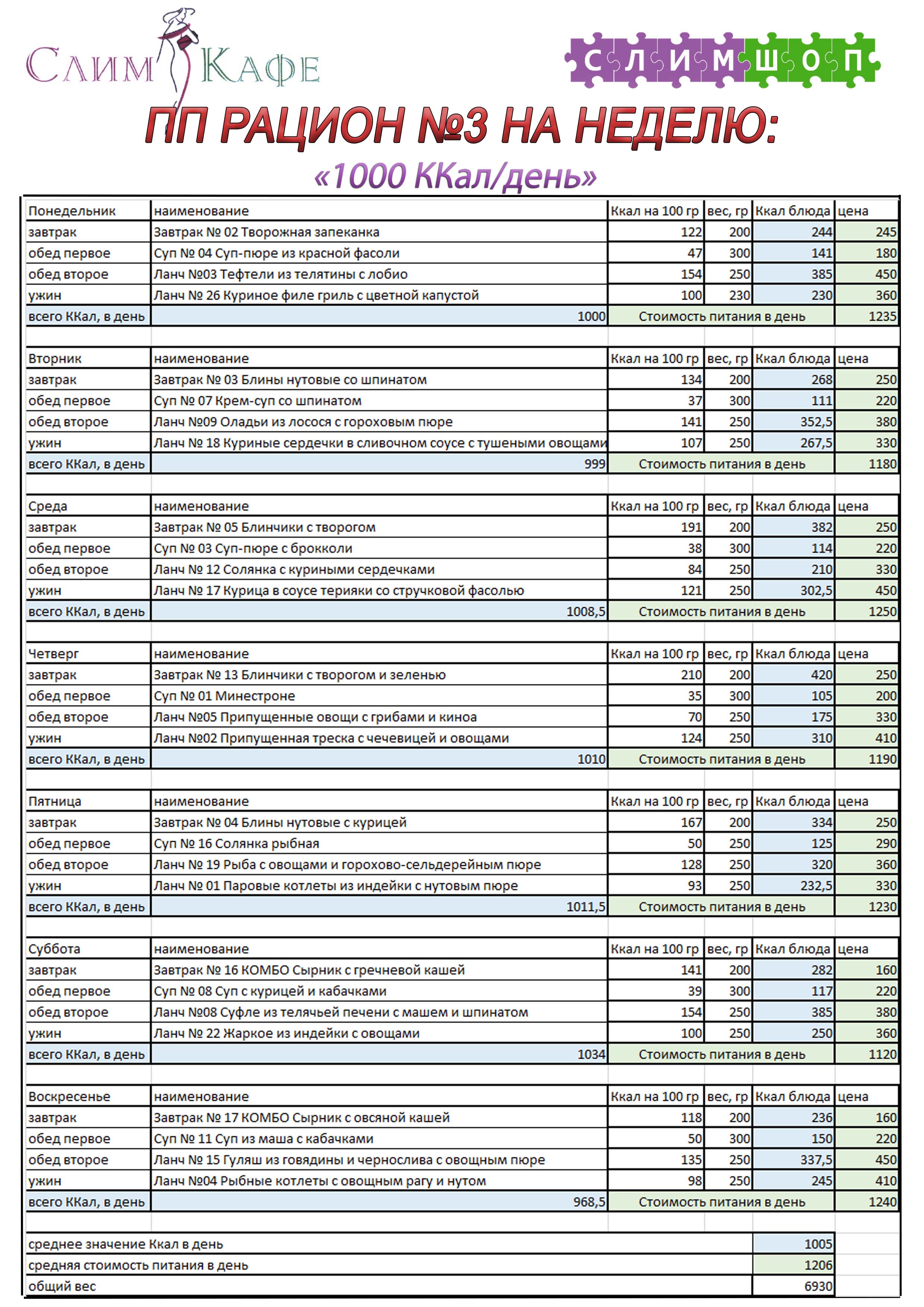 | Всего ККал, в день | 995 | Стоимость питания в день | 1190 | ||
