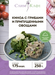 Вы не сможете пропустить это блюдо, приготовленное в СлимКафе. Киноа очень полезен, подходит для веганов и больных целиакией, поскольку не содержит глютена. Киноа похож на кус-кус и готовится так же, как рис, но содержит больше белка, клетчатки и аминокислот. Припущенные овощи с грибами и киноа - это замечательное, легкое и вкусное блюдо. Семена киноа обладают нежным привкусом орехов и приятной зернистой структурой, а сочетание с овощами делает их более вкусными и полезными.