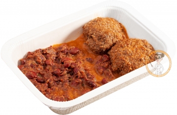 2 темно коричневых шарика без намека подливки и темно-коричневая кашеобразная масса с фасолью. Очень соленое на вкус: и фасоль, и "тефтели"