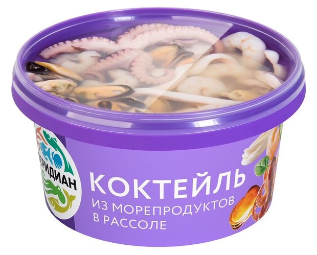Морепродукты отварные (мясо мидий (Mytilus chilensis), кальмар командорский (Berryteuthis magister) соломка, креветки очищенные (Penaeus vannamei), молодые осьминоги (Octopus vulgaris) кусочки), вода, соль (cод.антисл,агент Е536), регуляторы кослотности: лимонная, винная.
