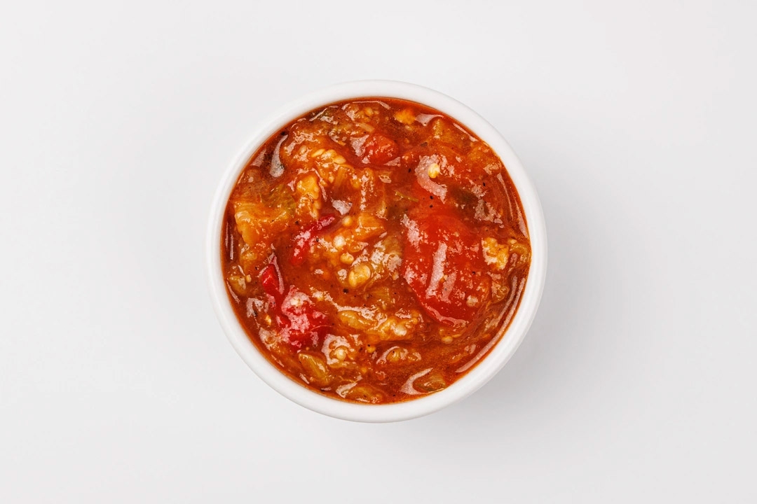 Блюдо восточной кухни с легким ароматом дымка. Изготовлено из запеченных овощей с добавлением специй и растительного масла. Вкусная и питательная закуска отлично дополнит ваши любимые блюда