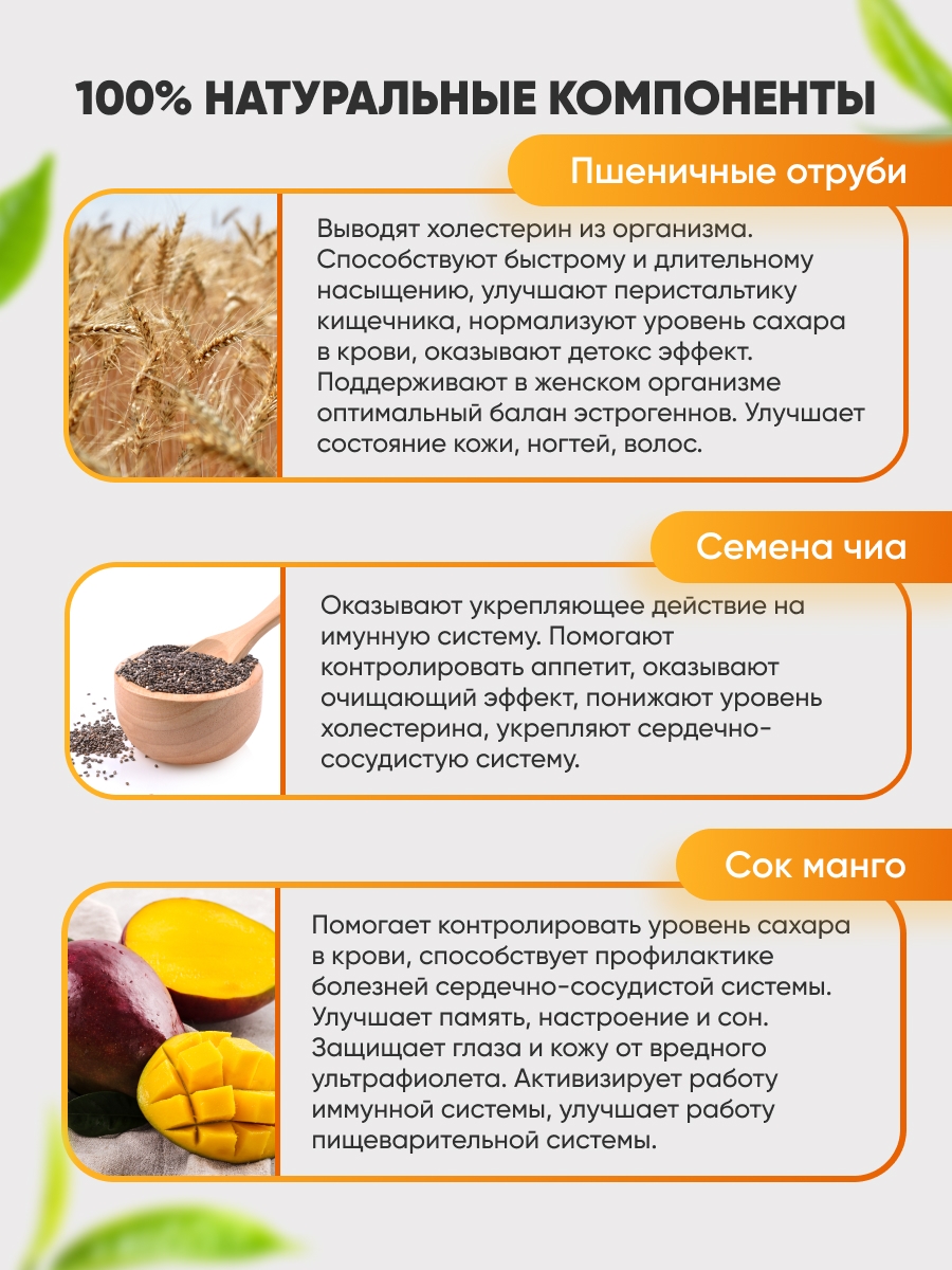 Ароматизатор, гуаровая камедь, стевиозид, манго концентрированный сок, подорожника оболочка семян порошок, отруби, Семена Чиа, экстракт куркумы, Экстракт гарцинии камбоджийской.