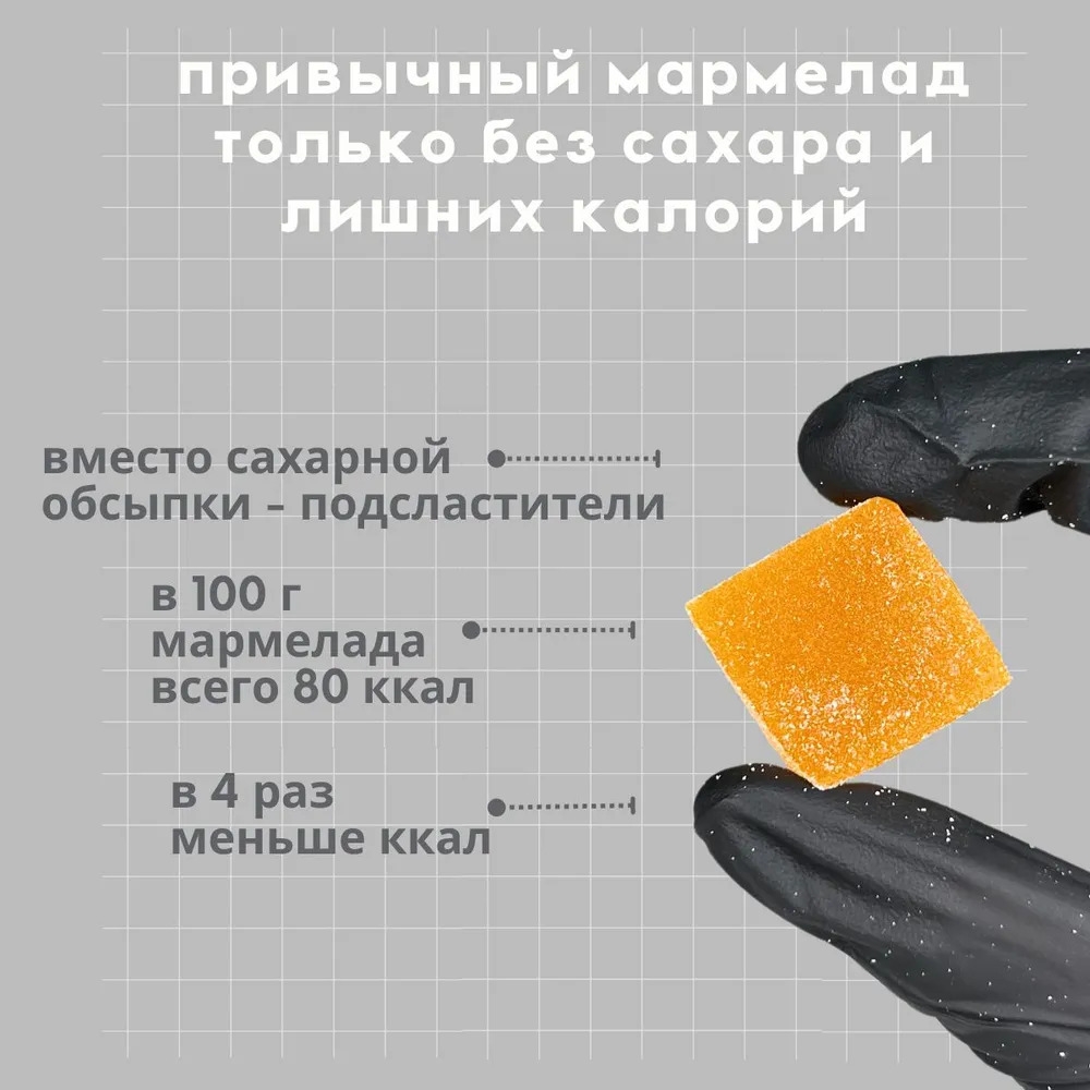 Полезная низкокалорийная альтернатива классическому мармеладу, ведь белый сахар в мармеладках заменен на аллюлозу.Что уменьшает калорийность мармелада в 4 раза и мы получаем всего 80 ккал на 100г. Мармеладки со вкусом «яркий цитрус» доставят удовольствие каждому гурману. Фруктовый мармелад изготовлен на основе пектина - натурального желирующего вещества, который получают из фруктов или ягод. Присутствие в мармеладе пектина делает его не только вкусным, но и полезным. Мармелад без добавления сахара сочетает изысканный вкус и высокое качество. Полезный десерт подойдет если вы заботитесь о своей фигуре, ведёте здоровый образ жизни и придерживаетесь правильного питания. Яркий и сочный мармелад, подарит радость и отличное настроение. Набор сладостей имеет удобный формат, упаковка 300 г. Вкусняшки подойдут в качестве небольшого вкусного подарка на любой праздник: день рождения, 8 марта, новый год, детский праздник