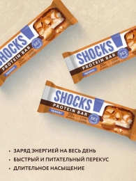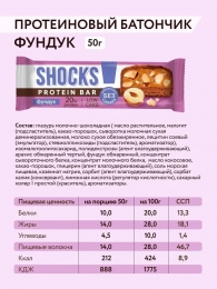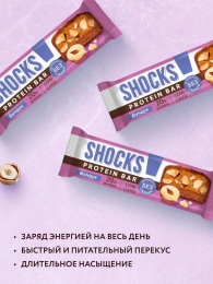 Насыщенный вкус дробленого обжаренного фундука с нежной сливочной нугой в нашей протеиновой новинке SHOCKS «Фундук» с 20% белка! Фундук играет важную роль в наших полезных батончиках – он богат витаминами A, E, C и группы B, содержит магний, калий, кальций, железо, цинк и фосфор. Также в нем много белка, клетчатки, полезных жиров и антиоксидантов, укрепляющих сердце, мозг и иммунитет. Наши протеиновые сладости совсем не отличаются по вкусу от тех, к которым вы привыкли. Главное преимущество SHOCKS – сочетание потрясающего вкуса и пользы в каждом десерте! Готовы поспорить, что вам сложно будет найти что-то похожее. Протеиновые батончики SHOCKS – уникальный десерт, который отлично подойдет в качестве полезного перекуса утром, на учебе, работе, в путешествии и на прогулке. Всего 1 батончик способен утолить чувство голода на несколько часов! Это идеальный вариант для тех, кто любит сладкое и придерживается здорового образа жизни. Батончики совсем не содержат сахара, в составе только качественный сывороточный протеин, что позволяет получить максимум белка и пользы. Батончики идеальны в качестве ежедневных перекусов с удовольствием и пользой. А те, кто любит спорт и ЗОЖ, найдут для себя в ассортименте Fitness SHOCK необходимое количество белка. Они дают возможность есть десерты каждый день и не испытывать чувство вины за это. Продукция подходит для ЗОЖ, ПП, как спортпитание. Приобретая ПП сладости без сахара, вы выбираете наслаждение вкусными десертами без вреда для здоровья и стройной фигуры. Сладкое может быть полезным!