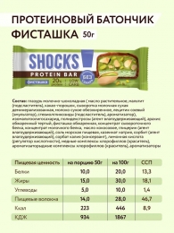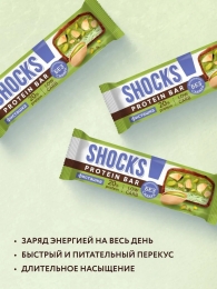 Насыщенный вкус дробленой обжаренной фисташки с нежной сливочной нугой в нашей протеиновой новинке SHOCKS «Фисташка» с 20% белка! Фисташка играет важную роль в наших полезных батончиках – она помогает контролировать вес, надолго давая чувство сытости, полезна для сердца, снижает уровень холестерина, улучшает зрение и пищеварение, содержит антиоксиданты. Наши протеиновые сладости совсем не отличаются по вкусу от тех, к которым вы привыкли. Главное преимущество SHOCKS – сочетание потрясающего вкуса и пользы в каждом десерте! Готовы поспорить, что вам сложно будет найти что-то похожее. Протеиновые батончики SHOCKS – уникальный десерт, который отлично подойдет в качестве полезного перекуса утром, на учебе, работе, в путешествии и на прогулке. Всего 1 батончик способен утолить чувство голода на несколько часов! Это идеальный вариант для тех, кто любит сладкое и придерживается здорового образа жизни. Батончики совсем не содержат сахара, в составе только качественный сывороточный протеин, что позволяет получить максимум белка и пользы. Батончики идеальны в качестве ежедневных перекусов с удовольствием и пользой. А те, кто любит спорт и ЗОЖ, найдут для себя в ассортименте Fitness SHOCK необходимое количество белка. Они дают возможность есть десерты каждый день и не испытывать чувство вины за это. Продукция подходит для ЗОЖ, ПП, как спортпитание. Приобретая ПП сладости без сахара, вы выбираете наслаждение вкусными десертами без вреда для здоровья и стройной фигуры. Сладкое может быть полезным!