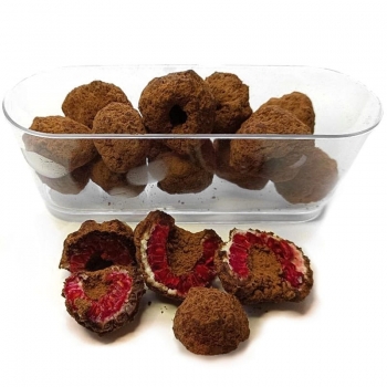 Идеальный десерт для любителей изысканных сладостей. Погрузитесь в мир наслаждения с свежей малиной в шоколаде и почувствуйте эмоции, которые приносит каждый укус этого изысканного десерта. Нежное сочетание кислинки спелой ягоды и богатого вкуса шоколада принесет вам настоящее удовольствие и станет прекрасным угощением для всей семьи. Внутри — замороженная малина в тёмном бельгийском шоколаде без сахара с обсыпкой какао. Ягоды отбирали вручную и заморозили так, чтобы сохранить их свежесть как можно дольше. Десерт стоит хранить в морозилке. Есть можно сразу, но ещё лучше оставить его в комнатной температуре на час и уже потом приступать.