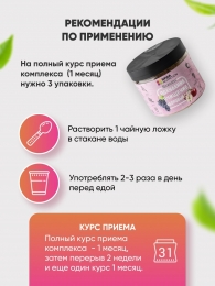 Для непосредственного употребления в пищу предварительно растворив 1 чайную ложку в стакане воды 2-3 раза в день перед едой. Полный курс приема комплекса для достижения эффекта 1 месяц, затем перерыв 2 недели и еще один курс 1 месяц, после такой курс рекомендуется проводить 2-3 раза в год или чаще до достижения необходимого результата по похудению.