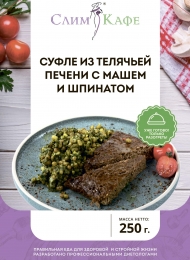 Суфле из телячьей печени с машем и шпинатом, приготовленное в СлимКафе и приправленное ароматными специями, подойдёт для лёгкого обеда и ужина. Это питательное и полезное блюдо отлично подходит для диетического питания. Печеночное суфле получается очень вкусным и ароматным, с нежной консистенцией. Телячья печень ценится за большое содержание витамина A и E. Она очень полезна, так как укрепляет сердечно-сосудистую систему и ускоряет процессы регенерации в тканях. Шпинат обеспечивает организм необходимыми питательными веществами: аминокислотами, витаминами, минералами и др., а маш обладает многими полезными свойствами для организма. Сочетание всех ингредиентов этого блюда - настоящий кладезь витаминов.