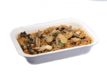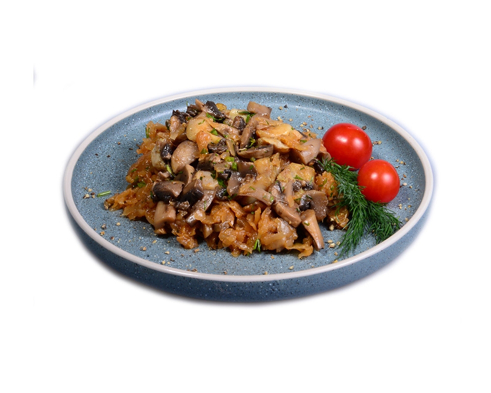 Капуста белокочанная, филе бедра куриное, шампиньоны свежие, лук репчатый, корень сельдерея, оливковое масло, зелень укропа свежая, смесь специй «Хмели-сунели», кориандр молотый, чеснок сушеный, перец черный молотый, соль пищевая.