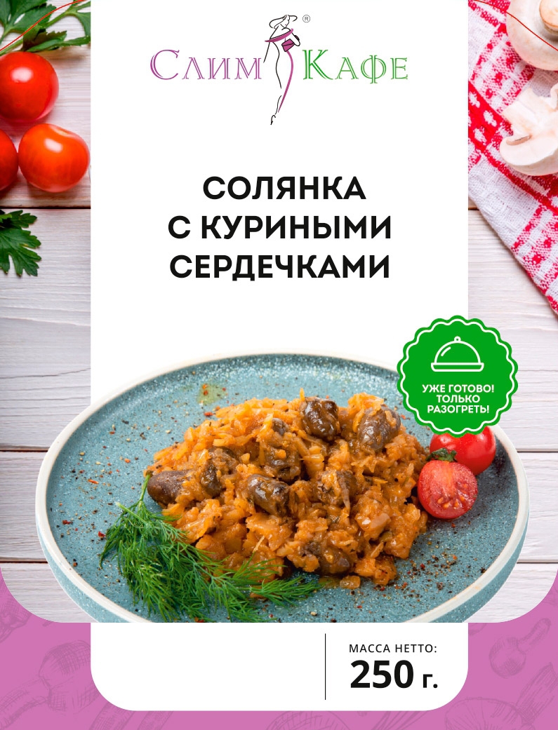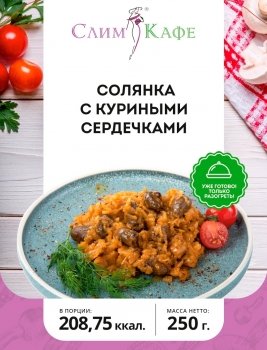 Солянка — вкуснейшее сытное старинное блюдо русской кухни из повседневного меню.Это низкокалорийное блюдо, которое помогает в процессе похудения: нормализует обменные процессы, улучшает состояние кожи и укрепляет стенки сосудов. О пользе витаминов, содержащихся в таком блюде можно вообще не говорить. Куриные сердечки можно назвать белковым продуктом, белок которого легкоусвояемый и низкокалорийный, плюс они обладают повышенным содержанием незаменимых аминокислот.