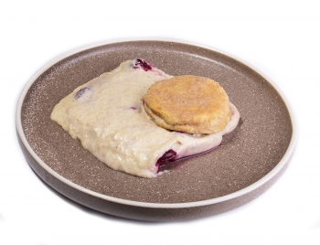 Творог 5%, яйцо, мука цельнозерновая, лен белый, ягоды с/м (вишня+ч. смор), эритрит, масло оливковое, соль.