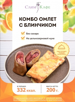 КОМБО Омлет с блинчиком, приготовленный в СлимКафе получается сытным, сочным и сочитает в себе вкуснейший омлет и умопомрачительный блинчик. Это очень просто и легко, а главное - полезно для вас и вашей фигуры. Одно из самых любимых и востребованных блюд в рационе правильного питания. Отличный полноценный завтрак или перекус - однозначно стоит попробовать!